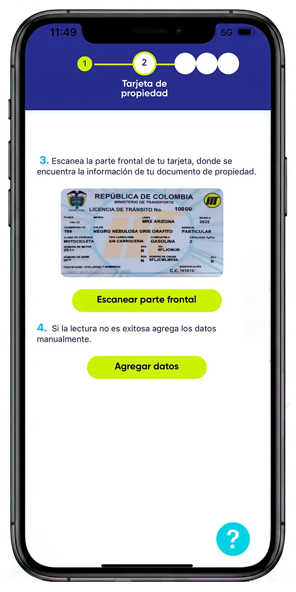 Escanea el código QR que vino con tu dispositivo, la matricula de tu moto y tu cédula.