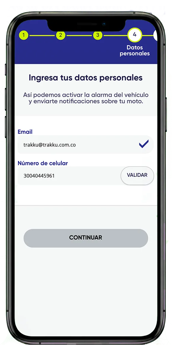 Regístrate en la APP de Trakku para que puedas tener el control de tu moto. Te puedes registrar como propietario o como conductor.